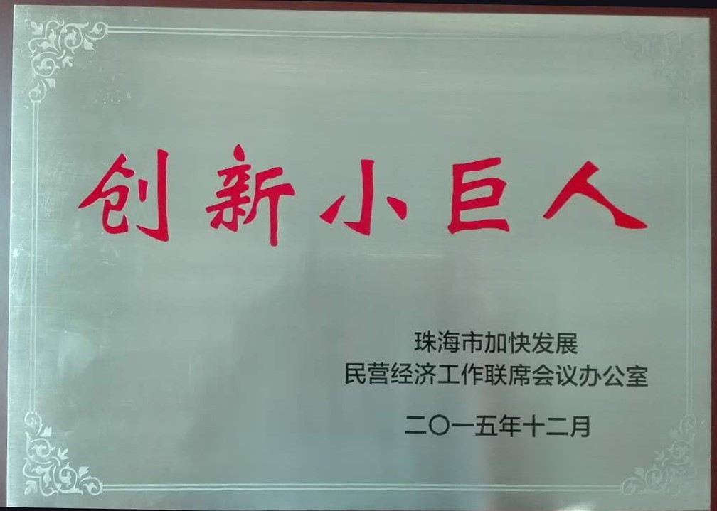 2016年7月29日,珠海市隆重召开了“珠海市民营经济工作会议”,我公司作为珠海市重点民营企业,派代表参加了会议。会上对获得“创新小巨人”称号的企业进行了授牌仪式,我司被评为“创新小巨人”,上台接受了由市委、市政府领导颁发的奖牌。
